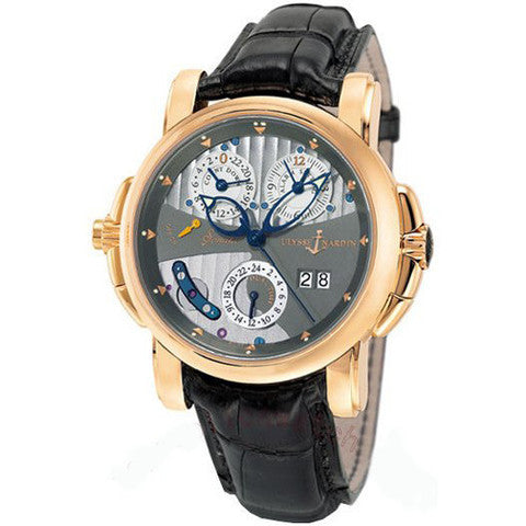 18kt pink gold 42mm case. Sapphire crystal glass front and back. Gray dial with luminous hour markers. Black crocodile strap with 18k pink gold buckle. Hours, minutes, seconds, date, alarm and GMT (2nd. Time Zone). 18k pink gold bezel. Automatic movement, UN Caliber UN-67, 109 jewels. Power reserve up to 42 hours. Water resistant up to 30 meters / 100 feet. The “Sonata Cathedral Dual Time” watch is an amazing creation with a mechanical alarm that has a crisp and beautiful chime / ring. The gray dial spectacularly finished with a partial silver linear “Cotes de Geneve” design. Large Skeleton Hands for Hours and Minutes which allows for a clear and unobstructed view of the dial. GMT / Dual Time Zone hour hand Sub-dial at 6 o’clock. Buttons on either side of the case adjust the time-zone by one hour increments either way. Alarm time indicator located at the 2 o’clock position. Sub-dial at 10 o’clock indicates a countdown to when the alarm will chime the next time – the alarm will chime once in 24 hours. On / Off indicator at the 9 o’clock position – controlled by the button in center of the left crown. While the alarm is ringing you can see the piston at work – located at the 8 o’clock position and held in place with a blue bridge. Left crown adjusts the time and date. Serial Number engraved on the bezel of the watch at the 6 o’clock position.