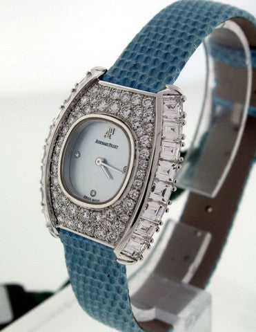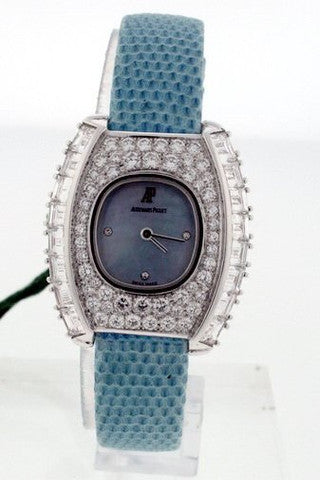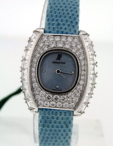 18k white gold tonneau shape 27mm 30mm diamond case. Light blue mother of pearl dial with 3 diamond hour markers. 18k white gold bezel set with round and baguette cut flawless, colorless diamonds. Quartz battery operated movement. Light blue snake skin leather strap. 18k white gold pin buckle.