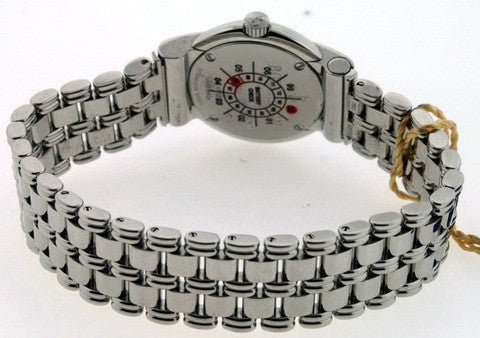 Stainless steel 26mm case. Mother of pearl colored dial. Hours and minutes. Stainless steel bezel. Quartz movement. Stainless steel bracelet with stainless steel deploy buckle. Water resistant up to 30m / 100ft. Bracelet easily opens at the top of the case by sliding entire bracelet directly to the right along the bracelet pin track.