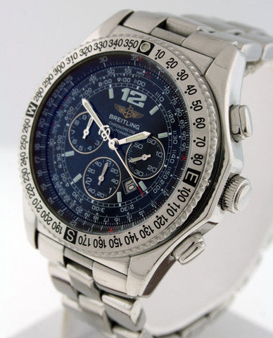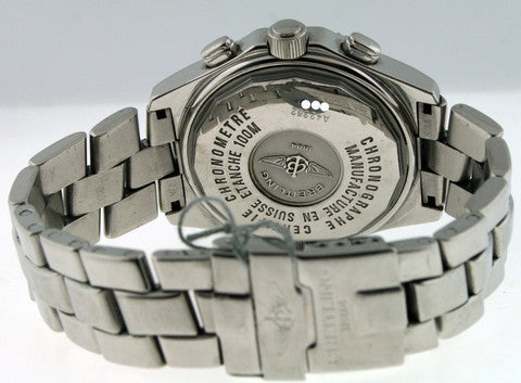 Stainless steel 43.5mm case. Sapphire crystal glass. Black dial with luminous index. Date aperture between four and five, white and red outer scales, constant seconds sub dial, ten minute and three hour registers hands and hour markers. Stainless steel crown. Stainless steel pilot bracelet will fit up to 8" wrist. Stainless steel bi-directional bezel with slide rule. Stainless steel lugs. Hours, minutes, date, slide rule and chronograph. Automatic movement, caliber 2892A2. Waterproof 100 meters / 330 feet.